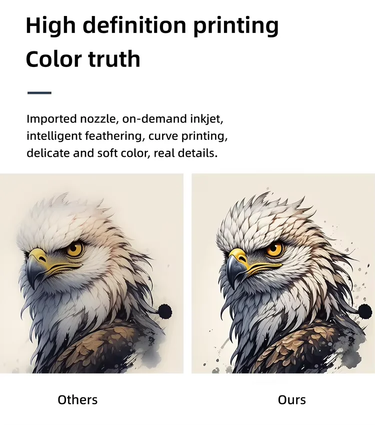 ventilyatorlar, sumkalar va sochiqlar kabi turli xil materiallar bilan mos ishlaydi va qog'ozni bosib chiqarish uchun keng qo'llaniladi. To'rtta tusli kartridj va bitta bo'rina boshidan iborat bo'lib, 1200 dpi yuqori aniqlikda rangli rasmlarni chiqarish imkonini beradi, shuning uchun ham yorqin va batafsil natijalarga ega bo'lasiz.