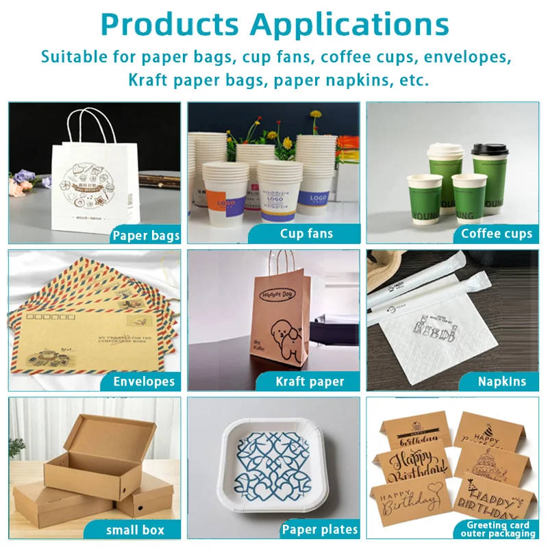 | Ilova | qog'oz sumka, shar do'koni, kofe stakanlari, konvert, Kraft qog'oz sumkasi, qog'oz servietka va boshqalar |