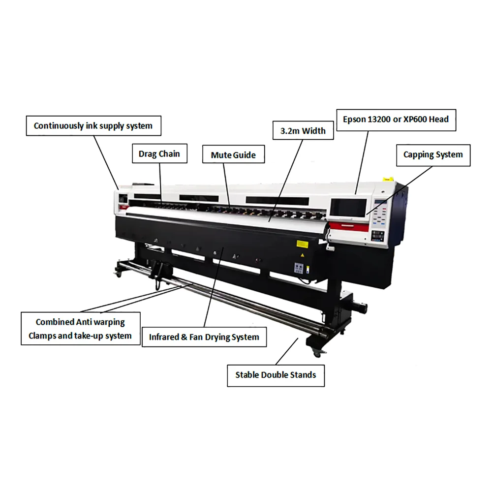 3,2 m keng formatli raqamli ekologik erituvchi bilan ishlaydigan printer I3200/XP600 print boshlari, 220V elektr ta'minoti va CMYK rang tizimiga ega. Banner va vinil nishonchalarni bosib chiqarishga ixtisoslashgan, sanoat va tijorat reklama ehtiyojlari uchun jonli, ob-havo sharoitiga chidamli chiqish natijalarini ta'minlaydi.