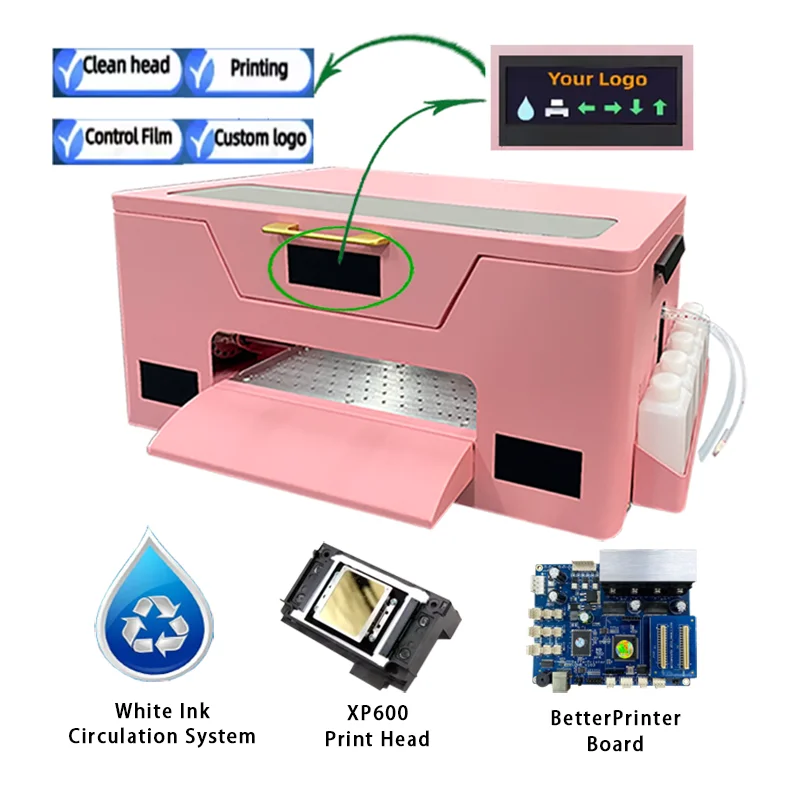 A3 DTF inkjet printer XP600 boshidan aylantiriladigan to'qimalarga nafis so'zlar bilan ishlov berish uchun mo'ljallangan, ayniqsa futbolkalarni moslashtirish uchun mo'ljallangan uslubli va amaliy yechimdir. Ishonchli Epson XP600 print boshini aylanma aylanish texnologiyasi bilan va charchoqtiradigan pushti DIY to'plam dizayni bilan birlashtirish orqali, ushbu printer hobi sifatida chop etishni xohlovchilar hamda kichik hajmdagi shaxsiylashtirilgan kiyim-kechak bizneslari uchun ham mos keladi. Barchasi bir nechta bo'lgan DIY to'plami sozlash va foydalanishni soddalashtiradi, foydalanuvchilarga yaratuvchan dizaynlarni yuqori sifatli issiqlik orqali uzatiladigan bosma materiallarga aylantirish imkonini beradi, shu bilan birga ko'zga tashlanarli pushti tashqi ko'rinishi bosma ish joyiga quvnoq, shaxsiylashtirilgan ta'sir qoldiradi.
