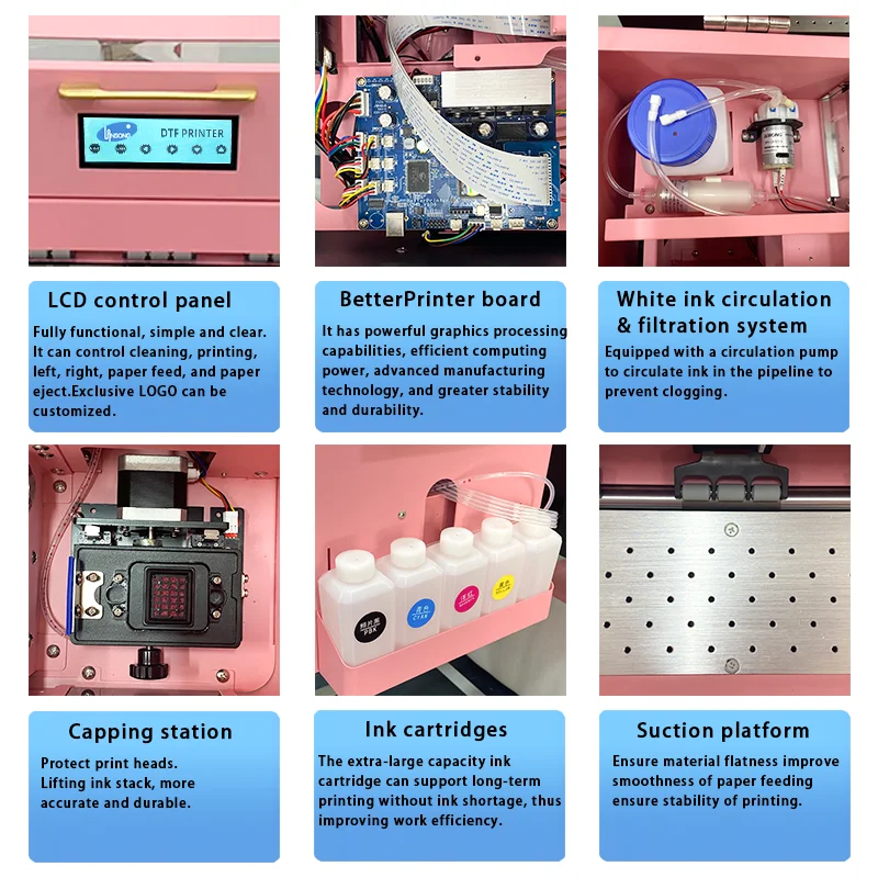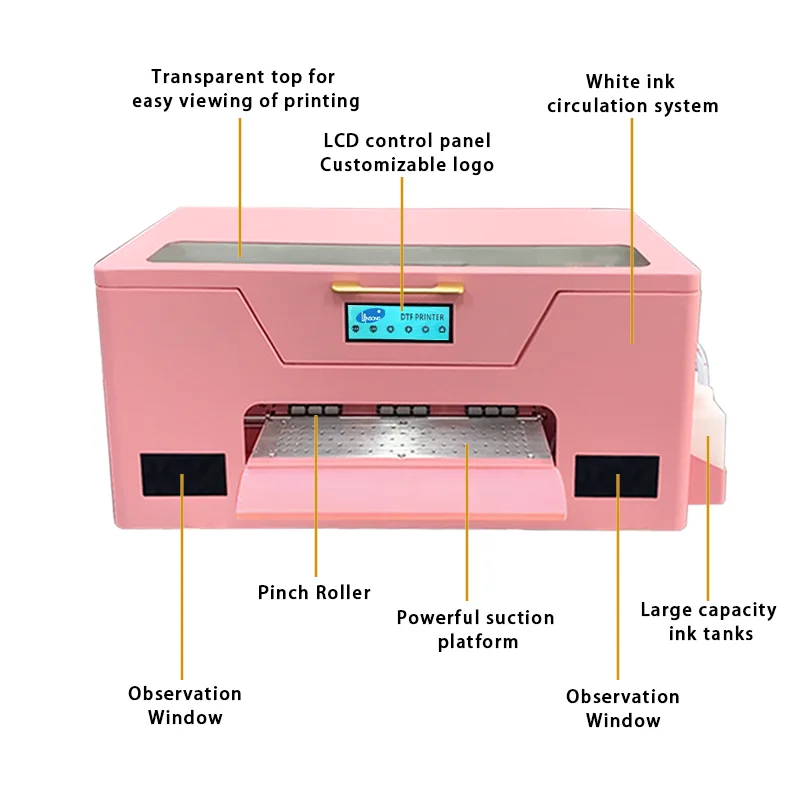DIY pushti to'plam dizayni boshlang'ichlar va DIY muhlislari uchun ushbu printerlarni qulay va jozibador qiluvchi asosiy jihat hisoblanadi. To'plam darhol foydalanish uchun zarur bo'lgan barcha komponentlarni, jumladan, printer, DTF sireni, uzatish plonkasini va asosiy vositalarni o'z ichiga oladi — aksessuarlarni alohida sotib olish kerak bo'lgan qiyinchiliklarni bartaraf etadi. Foydalanuvchiga qulay sozlash qo'llanmasi o'rnatishni soddalashtiradi, hatto mutaxassislardan bo'lmagan hamda texnik tajribaga ega bo'lmagan odamlar ham tez boshlashlari mumkin. Charmantli pushti tashqi ko'rinishi an'anaviy sanoat printerlarining monotonligini buzadi va uy studiyalariga, mehnat xonalari yoki kichik savdo do'konlariga o'yinchoq va ijodiy atmosfera qo'shadi.