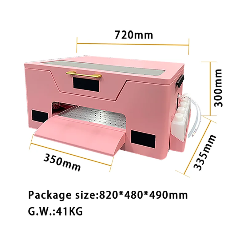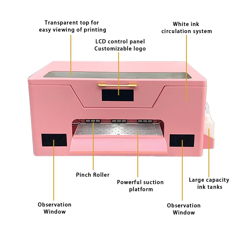 Ushbu printerning ajralib turgan xususiyati — kichik o'lchami va ko'zga tashlanadigan pushti dizayni. Standart A3 DTF printerdan ancha kichik bo'lib, u juda kam joy egallaydi va uni uy studiyasida, kichik ishxonalarda yoki savdo-do'kon maydonlarida ham joylashtirish qulay, tartibsizlikka sabab bo'lmaydi. Zamonaviy pushti tashqi ko'rinish an'anaviy sariq yoki kulrang sanoat uskunalari monotonligini buzadi va ish muhitiga moda va ilhomlantiruvchi hissiyot bag'ishlaydi — ijodiy, zamonaviy estetikaga ega bo'lishni xohlaydigan brendlar yoki studiyalar uchun ajoyib tanlov. Tashqi ko'rinishdan tashqari, ixcham tuzilma barqarorlik uchun mo'ljallangan bo'lib, cheklangan fazoda ham silliq ishlashni ta'minlaydi.