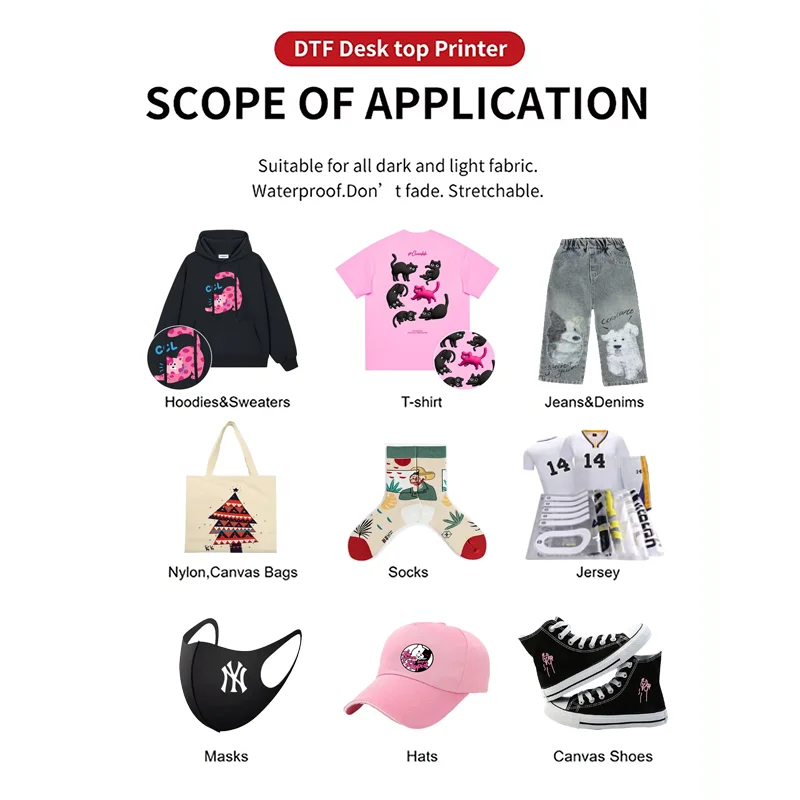 Bir nechta substratlarda o'ziga xos ko'p qirralilik bu printerni sozlash uchun ko'p funktsional vositaga aylantiradi. Bu yerda paxtalik futbolkalar, linka kiyimlari, jinslar, mato pantoloni, mato yostiqlari va hatto charm yoki PU poyabzallar kabi turli xil mahsulotlar bepul ishlab chiqariladi. Ushbu keng moslik foydalanuvchilarga xizmat takliflarini kiyim-kechakdan tashqari kengaytirib, shaxsiy hayot tarzi mahsulotlari uchun har xil mijozlarning talablariga javob berishga imkon beradi. A3 bosma kengligi bu kichik va o'rta hajmli buyumlar uchun optimallashtirilgan bo'lib, dizaynlar materiallarni sarflamasdan mukammal mos kelishini ta'minlaydi. Shaxsiy ijodiy loyihalar, kichik turkumli brend ishlab chiqarish yoki mijozlar uchun maxsus buyurtmalar uchun bo'ladimi, ushbu printer turli xil ish jarayonlariga mos keladi.